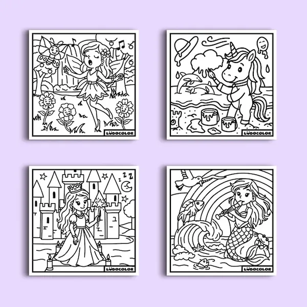 Chaque illustration met en scène une héroïne magique : une princesse, une licorne, une fée et une sirène.