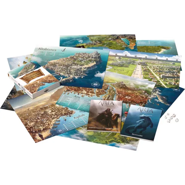 Ce coffret contient les cartes d’Aria, de Kniga, Aqabah, Altabianca, Varna, Esperanza, l’Osmanlie, Irem et le Pays Môn, ainsi qu’une carte du continent d’Aria. Vous y trouverez également un livret bestiaire des créatures du continent et un guide des personnages extraordinaires à y rencontrer.