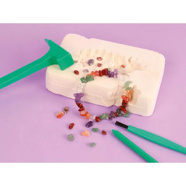 Pour pouvoir assembler leur magnifique bracelet, les enfants vont devoir déterrer les pierres et cristaux du bloc de plâtre à l'aide des outils !