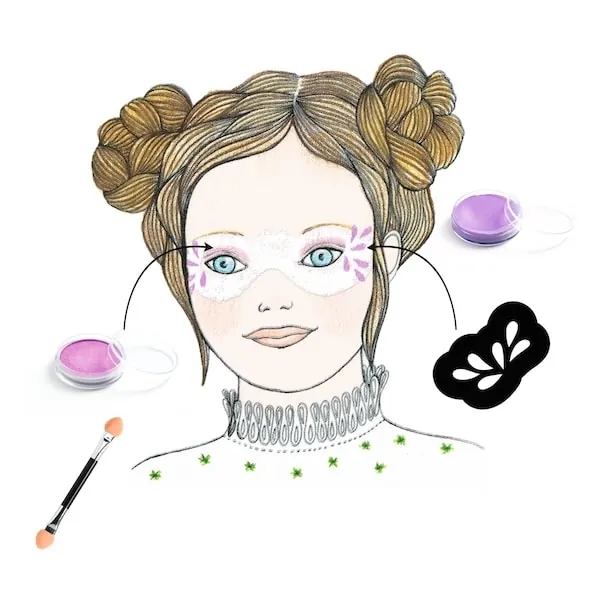 Contient : 4 fards gras, 1 fard à paupière métallisé, 1 crayon, 1 pinceau, 2 mousses, 1 pinceau ombreur double embout, 1 planche de pochoirs de peau, environ 75 perles et strass adhésifs pour la peau, 1 livret explicatif et 3 modèles.