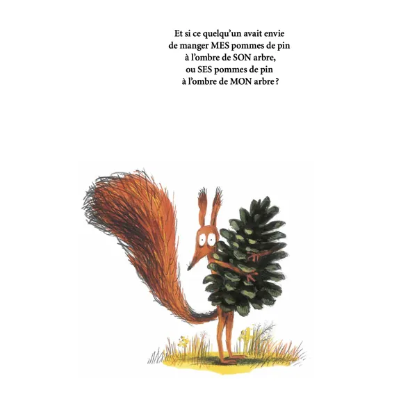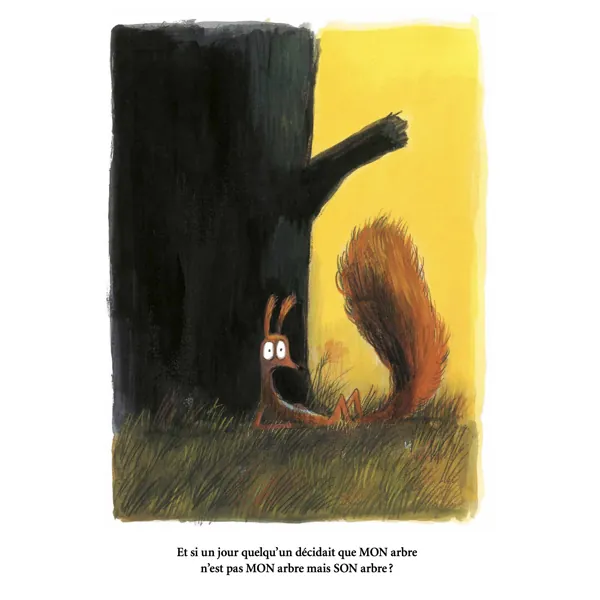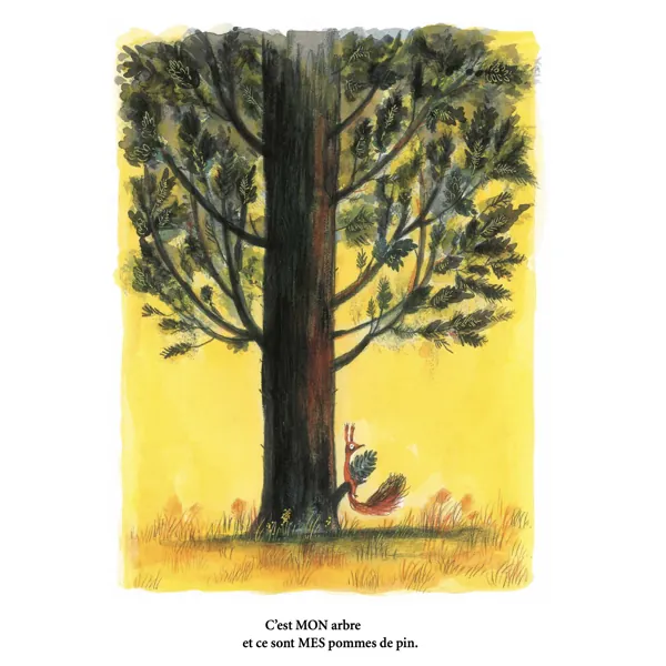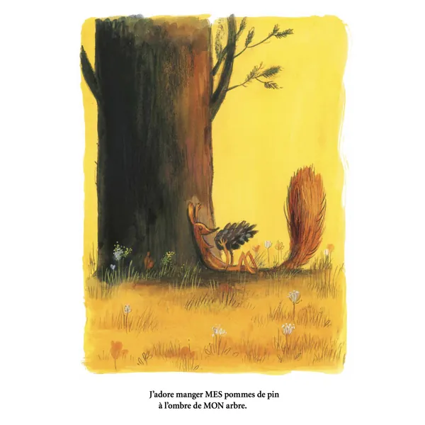 J’adore cet arbre. C’est MON arbre, dit le bel écureuil roux. J’adore manger MES pommes de pin à l’ombre de MON arbre. C’est MON arbre et ce sont MES pommes de pin. Tout le monde doit savoir que ce sont MES pommes de pin et que c’est MON arbre. Que faudrait-il faire pour le protéger des autres ?