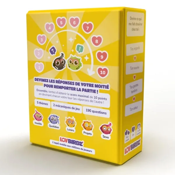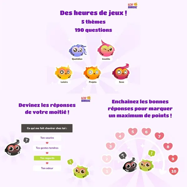 LovBirdz est un jeu de quiz qui s’adresse aux couples qui veulent renforcer leur complicité en passant de bons moments à deux, sans prise de bec.