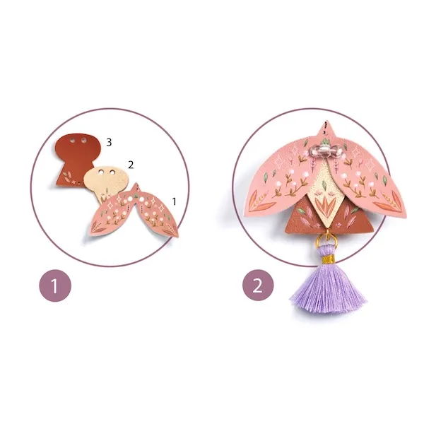 Contient : 20 pièces en cuir synthétique perforées, 4 planches de décalcomanies, 3 rubans en satin, 2 élastiques, 4 perles, 3 pompons, 1 support de broche avec sécurité, 10 anneaux de jonction en métal doré, 1 fermoir doré, 1 aiguille, 1 arbre en carton porte-bijoux, 1 feuillet de pas-à-pas détaillé.
