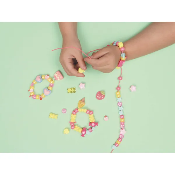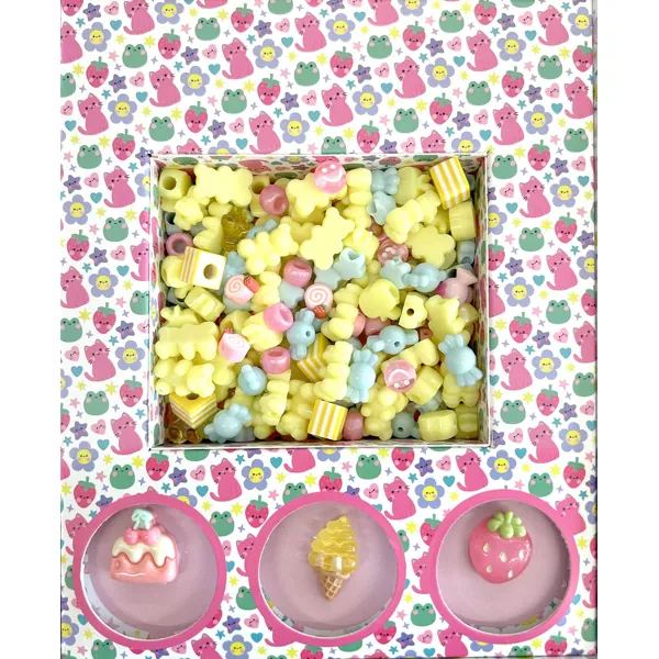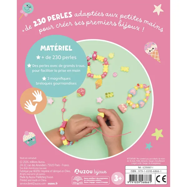 Un coffret complet avec un assortiment de perles de couleurs et de formes variées, et 3 magnifiques charms gourmandises pour créer ses premiers bijoux.