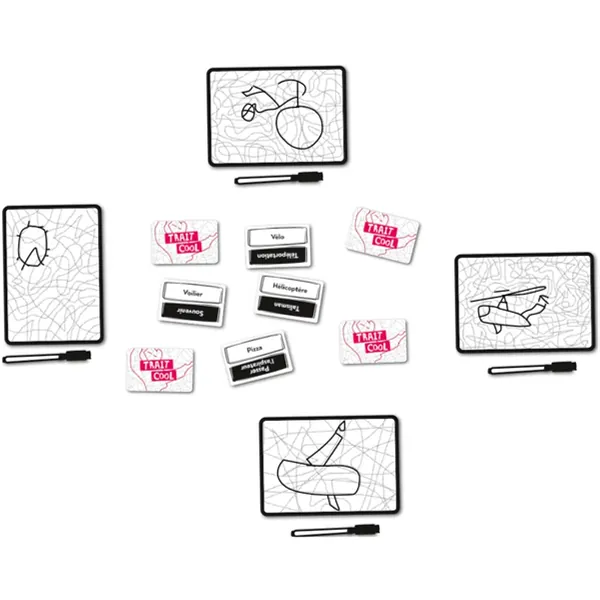 Trait Cool propose une expérience créative et coopérative unique : chaque joueur tente de faire deviner un mot en ne dessinant qu’à travers un réseau de traits déjà tracés. Chaque joueur pioche secrètement un mot et doit le dessiner sur son ardoise… mais uniquement en suivant les lignes pointillées déjà présentes. Ces contraintes transforment chaque croquis en casse-tête graphique ! Une fois les dessins terminés, toutes les cartes-mots sont mélangées avec des leurres et révélées.