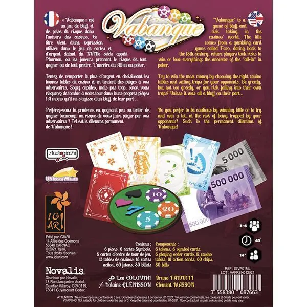 Vabanque est un jeu de bluff et de prise de risque dans l'univers des casinos pour 3 à 6 joueurs.